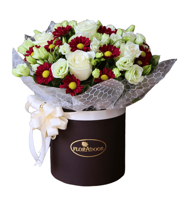 An elegant arrangement of Roses, Lisianthus and chrysanthemums wrapped together in a round box.