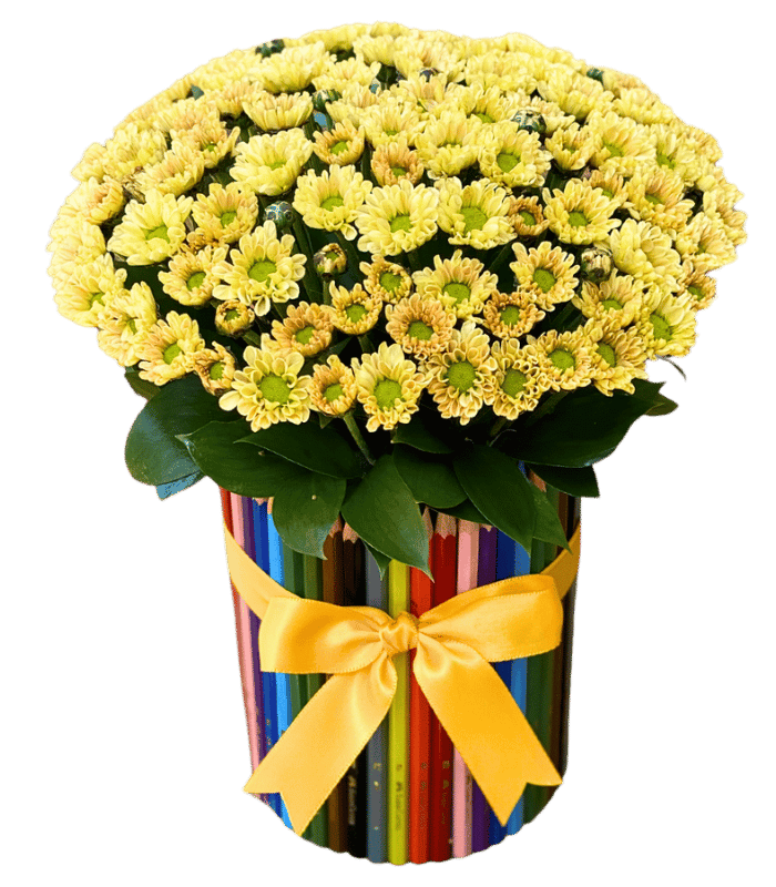 A collection of colored pencils arranged together as a gift in a vase with lovely chrysanthemum flowers.