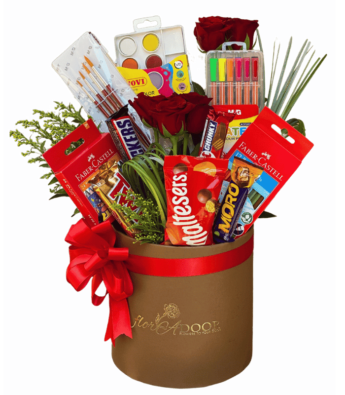 A collection of School supplies arranged in a gift box with red roses, chocolates and greenery.