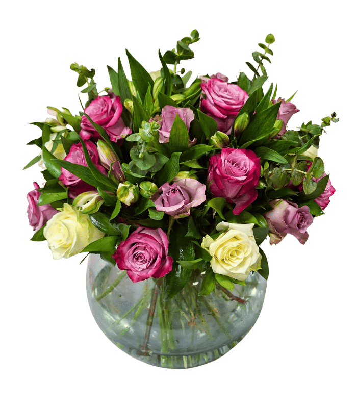 An elegant arrangement of 20 roses and 10 alstroemerias, arranged in a glass bowl with greenery.