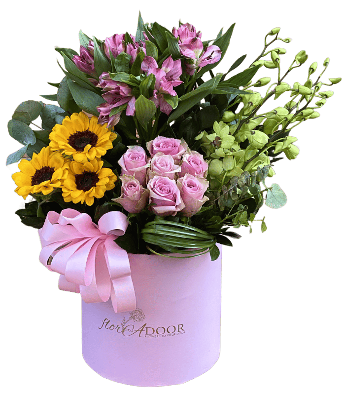 A warm arrangement of pink roses, alstroemerias, sunflowers and orchids.