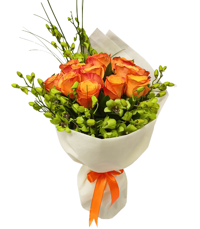 An elegant arrangement of roses and baby orchids in a hand bouquet.