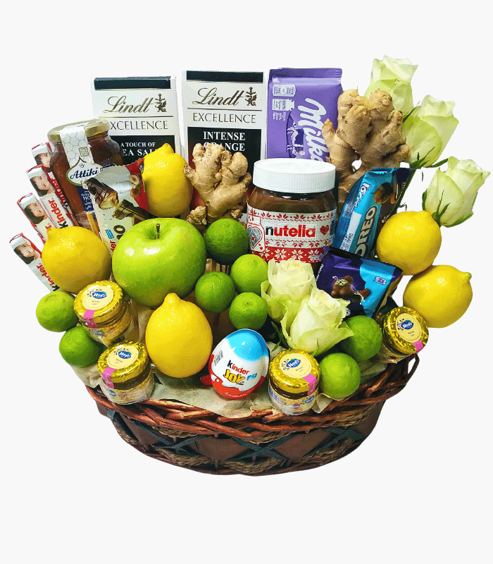 An arrangement of Lemon, Ginger, Apple, Honey, with mixed chocolates and roses.