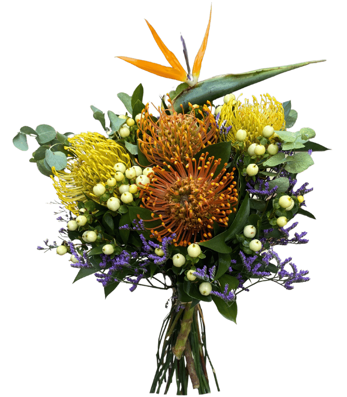 A special mixture of Protea, bird of paradise flowers with greenery and fillers.