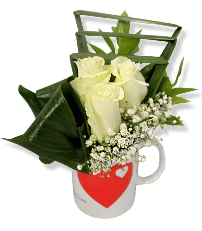 3 white roses with the best quality from Kenya arranged with baby flowers and imported greenery in a lovely mug. Suitable for every occasion with the best online flowers delivery service in Egypt.