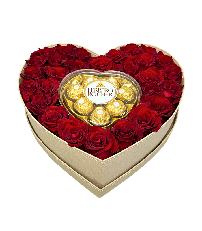 An arrangement of approximately 25 premium imported roses arranged with a box of Ferrero chocolates in a handmade leather box of a heart shape.