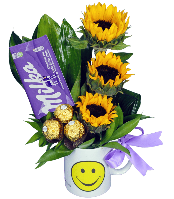 A smiley mug arranged with sunflowers, chocolates and greenery.