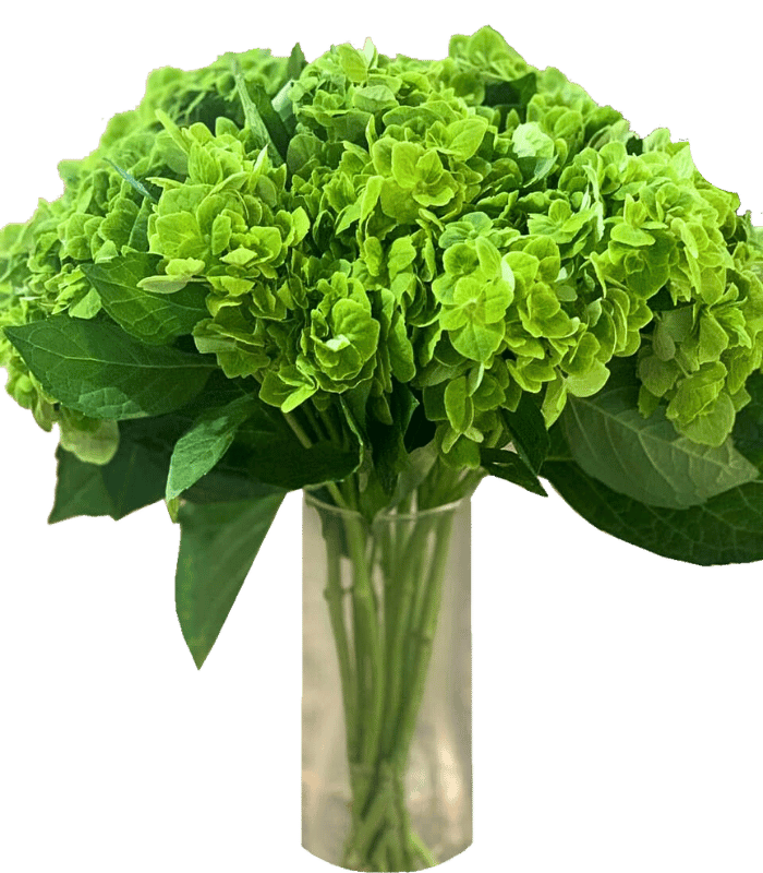 A pure arrangement of 10 Green Hydrangea flowers in a glass vase.