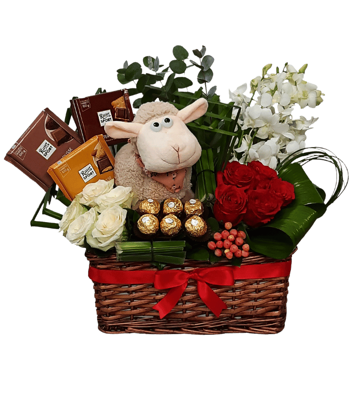 A lovely basket arranged with roses, orchids, chocolates, greenery and a sheep.