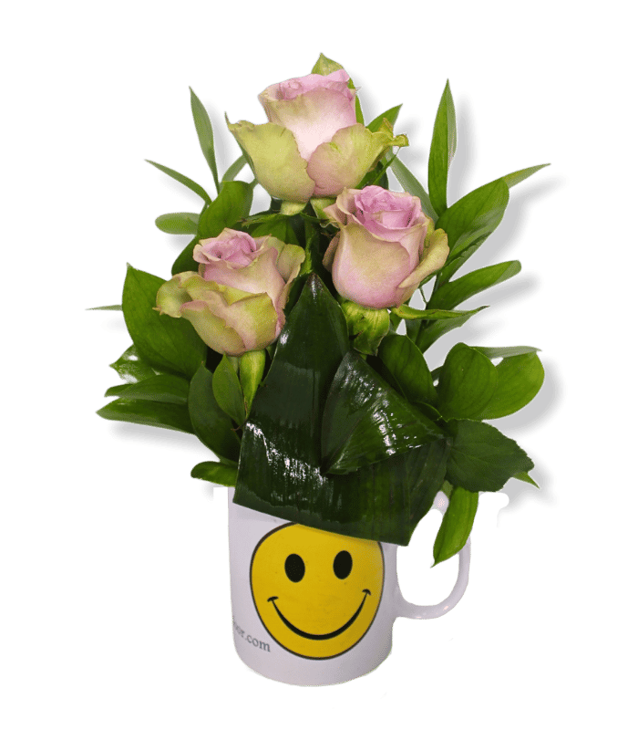 3 Purple roses with the best quality from Kenya arranged with imported greenery and fillers in a smiley face mug to draw a smile on your loved one’s face, suitable for every occasion with the best online flowers delivery service in Egypt.