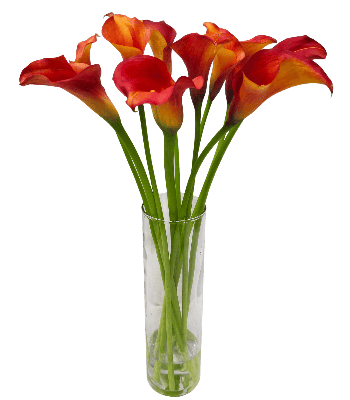 An elegant arrangement of 9 calla lilies in a cylindrical vase.
