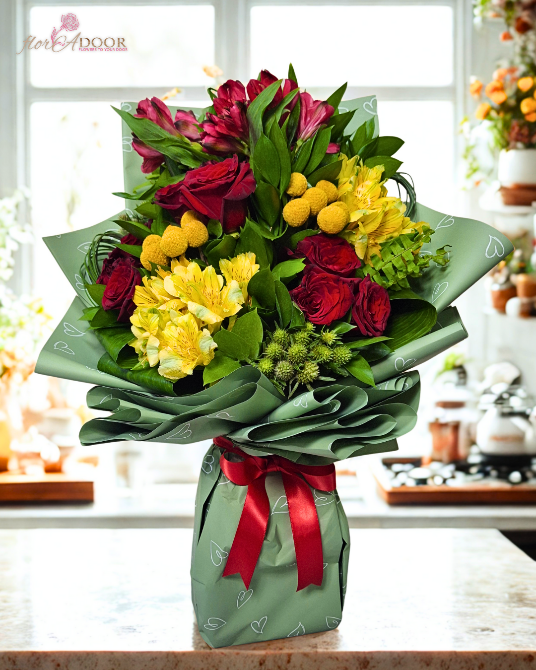 A premium arrangement of Roses, Alstroemerias, Eryngium and Craspedia with greenery in an elegant bouquet.