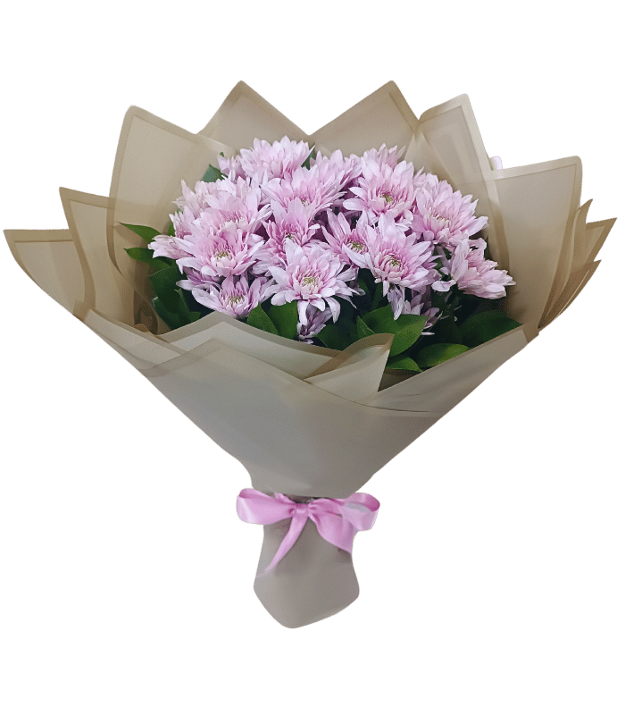 An amazing flower arrangement of 10 pink chrysanthemums with greenery in a hand bouquet.