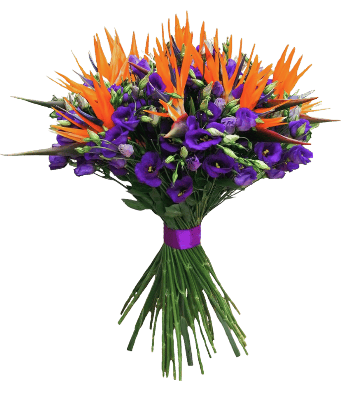 An elegant arrangement of purple lisianthus and Strelitzia tied with a ribbon.