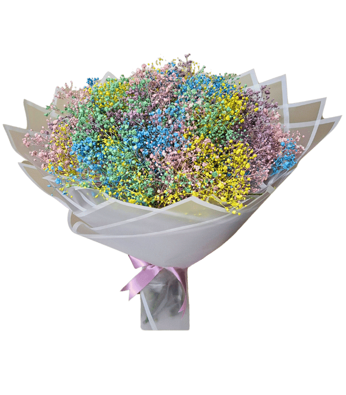 A colorful arrangement of dyed baby flowers with different colors in a hand bouquet.