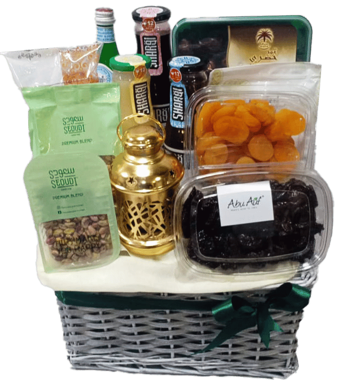 A Lantern, Cashew, Pistachio, Walnut, Dried grapes, Dried Apricots, Dried Plum, Dates, 3 Syrup bottles and a sparkling water bottle arranged in a lovely basket.