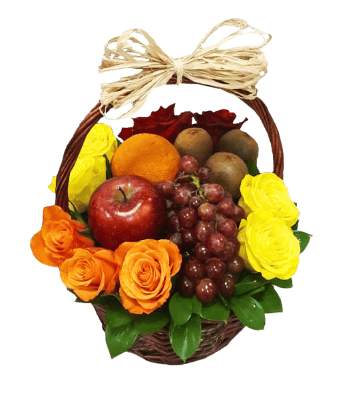 A sweet arrangement of flowers and fruits in a small basket.