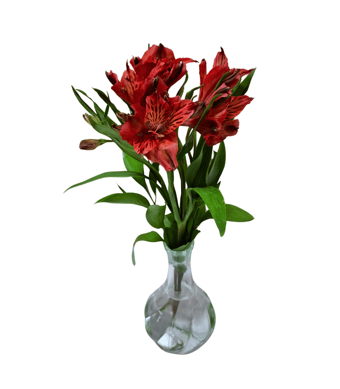 A single red alstroemeria flower with greenery in a small glass vase.