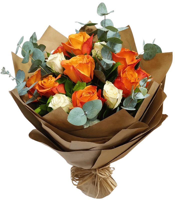 A classy arrangement of 17 orange and white roses with greenery in a hand bouquet.