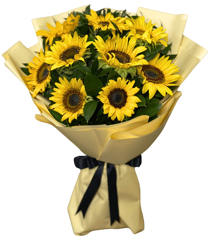 An elegant arrangement of 10 Sunflowers mixed with greenery arranged in a hand bouquet