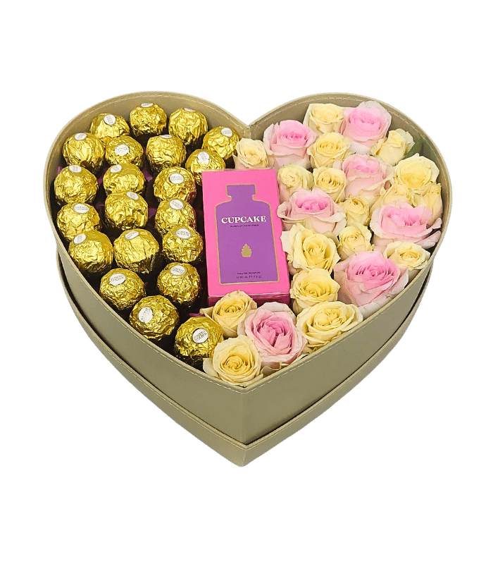 An arrangement of approximately 15 premium imported roses arranged with 21 Ferrero chocolates in a handmade leather box of a heart shape, With a perfume bottle from a premium brand in Egypt.