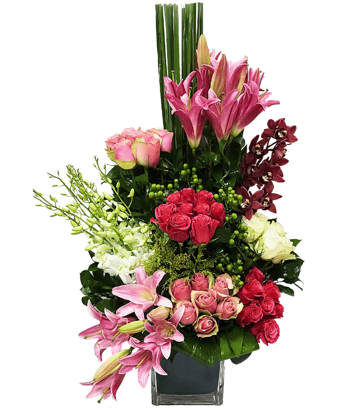 An amazing mix of orchids, roses, and Lillies arranged together with greeneries in a glass vase.