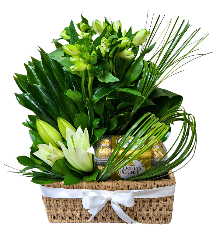 An elegant arrangement of white alstroemeria and lily flowers in a basket with greenery and a box of Ferrero Rocher chocolates.