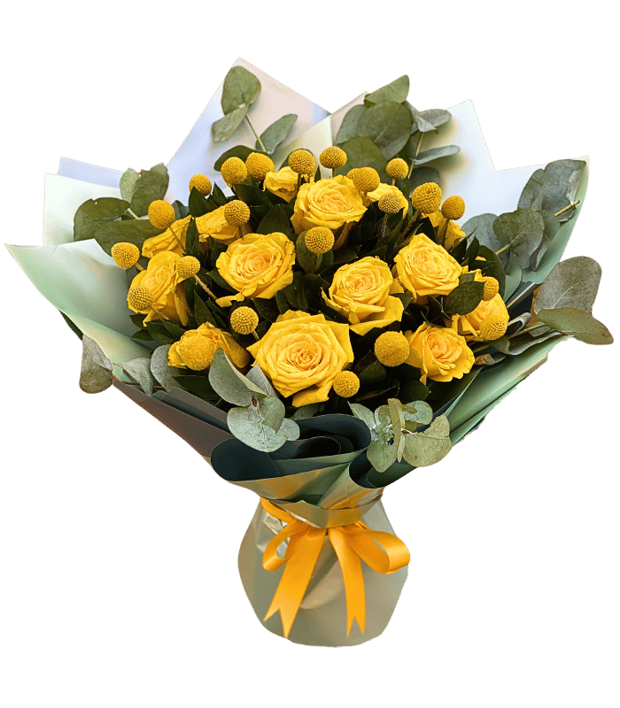An elegant arrangement of 15 yellow roses with Craspedia, Eucalyptus and greenery wrapped in a classy hand bouquet.